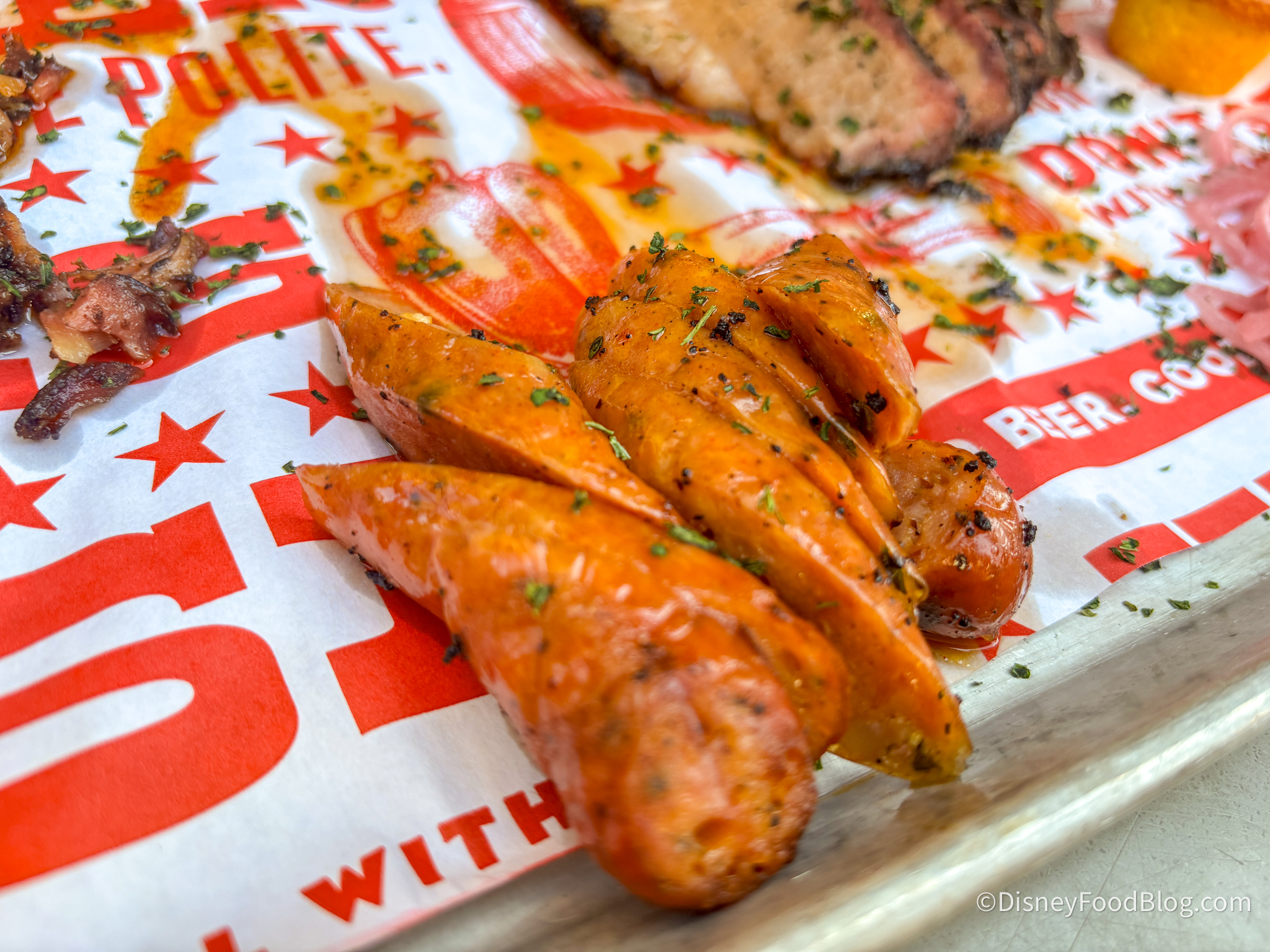The Sausage has a bit of spice to it, so beware of that! You can feel the burn on your tongue, and the spice does build as you continue to chew, so make sure you’ve got some water nearby. It has a great snap to the shell, and the inside is soft and juicy, so this was a win in our book.