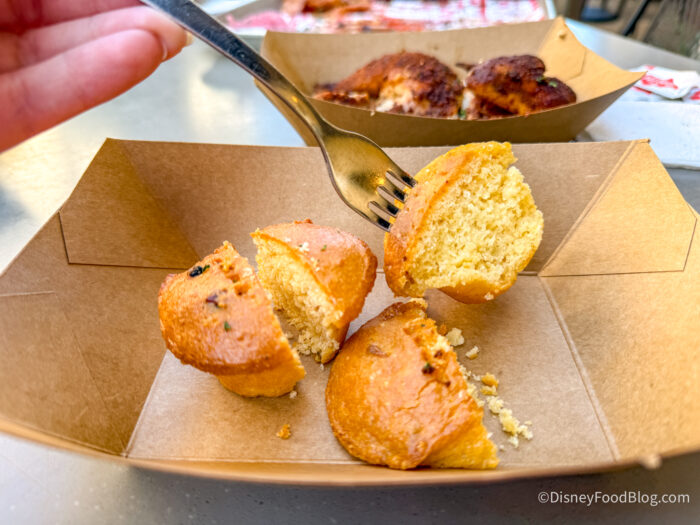 We wish we had enjoyed the Cornbread more, but it was pretty dry. They did have a good amount of cornmeal flavor, and are on the sweeter side, but we just found them hard to chew and swallow, being as dry as they were.