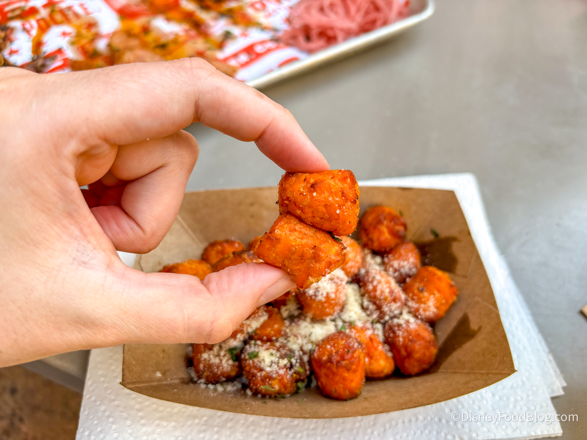 Finally, we have the Sweet Potato Tots, which may have been our favorite thing on the plate! They had plenty of sweet potato flavor and were fairly crispy on the outside and very soft and moist on the inside. It’s topped with Parmesan cheese that adds a bit of savoriness and nuttiness, and while there’s parsley on top as well, you don’t taste it much. Some of them were more soggy, just like sweet potato fries often are, but we were still big fans!