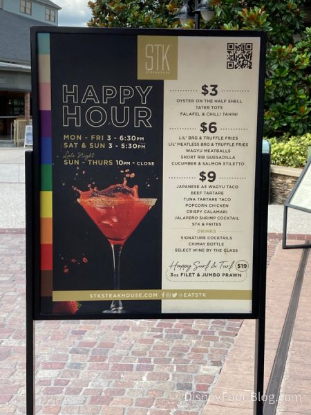 $3 Happy Hour food options include Oyster on The Half Shell, Tater Tots, and Crab & Corn Fritters, $6 options include Lil’ Brg & Truffle Fries, Wagyu Meatballs, Short Rib Quesadilla, Pastrami Salmon Cones, and Mushroom Arancini, and $9 options include Japanese A5 Wagyu Taco, Jalapeño Pickled Shrimp Cocktail, Beef Tartare, Tuna Tartare Taco, Popcorn Chicken, Crispy Calamari, STK & Frites, and the STK Cheeseburger.
