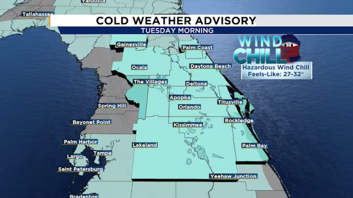 The cold weather will remain in the area, bringing cold weather advisories and freeze warnings. According to the forecast, cold temperatures will persist at Disney World for several days. On Tuesday morning, around 3 AM, the feels-like temperature in Orlando will be 31 degrees. On Sunday, February 1st, the low temperature is currently 28 degrees with a high of 48 degrees.