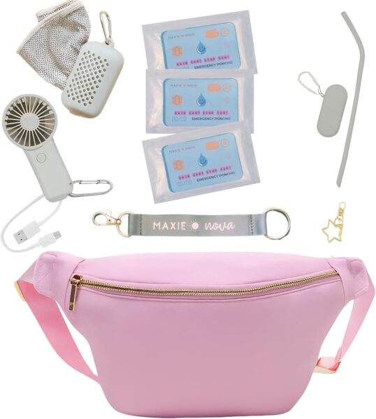 The Theme Park Day Essentials Kit includes three compact emergency ponchos, a USB-rechargeable handheld fan with charger, an instant-cooling towel, a reusable silicone straw with case and cleaner, and an ear and hat holder keychain clip. The bag is a high-quality, water-resistant, pink or blue fanny pack with luxe gold hardware. It’s everything you’ll need in one handy dandy kit! Get the $90 valued kit below for only $60!