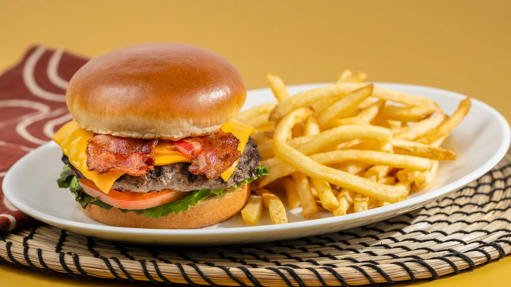 You can grab a Bacon Cheeseburger for $13.99. There’s also a Cheeseburger without bacon for $13.29. Both are served with lettuce, tomato, and French fries.