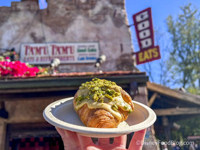 What’s a trip to the Disney World theme parks without grabbing a snack? While we were in Disney’s Animal Kingdom this morning, we made a stop by Tamu Tamu Refreshments to grab a Pistachio Croissant.