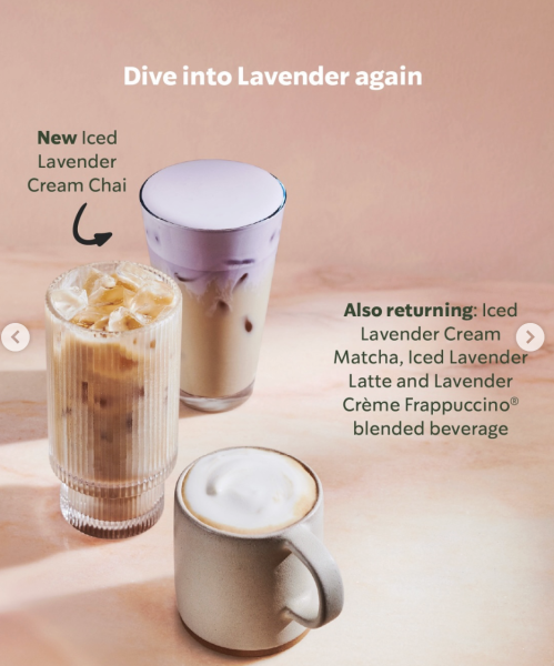 Next, we have the new Lavender Cream Chai! For returning favorites, we have the Iced Lavender Cream Matcha, the Iced Lavender Latte, and the Lavender Creme Frappuccino!