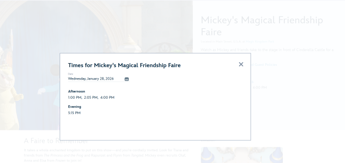 Alright, let’s talk about the popular stage show that takes place on the stage multiple times a day, Mickey’s Magical Friendship Faire. This musical extravaganza features Mickey and his pals as they make new friends with various iconic Disney characters. The show features your favorite music and characters from Princess and the Frog, Tangled, and Frozen.