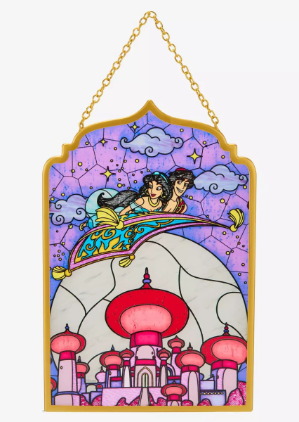 Starting off with this gorgeous stained glass art featuring Aladdin and Jasmine flying high on the magic carpet. This hanging wall art is made of glass and measures about 7 1/2″ x 11 1/4″. We love the vibrant colors, and we are already imagining where we will hang it on our walls!