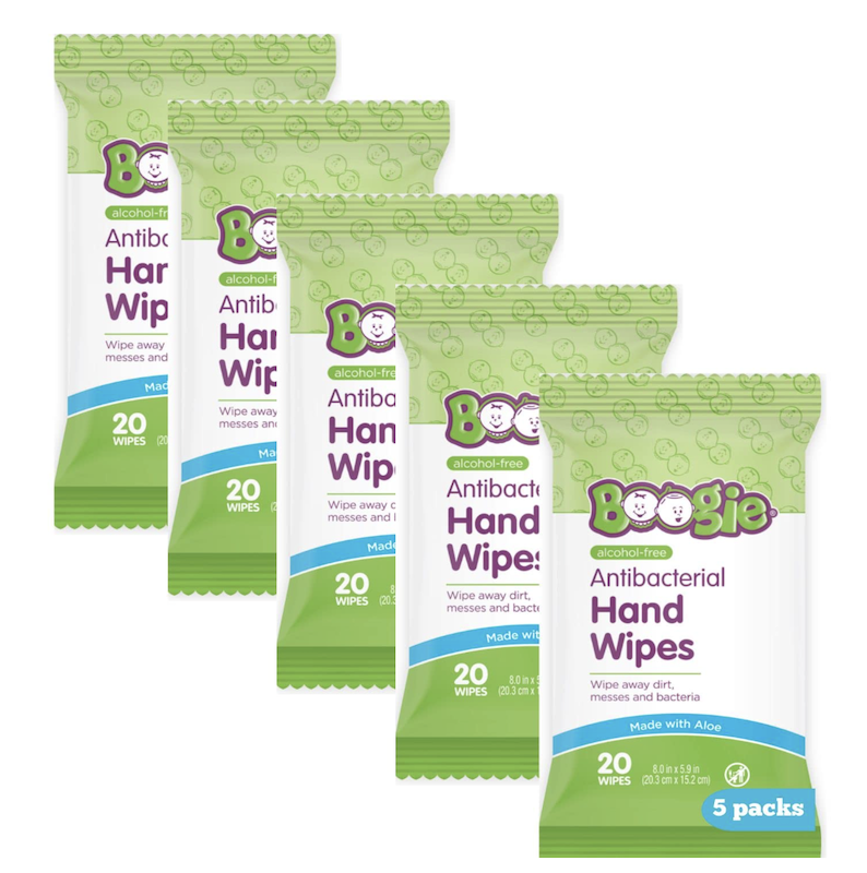 Boogie Antibacterial Hand Wipes wipe away dirt, messes, and bacteria from the hands and body when soap and water are not available. The gentle formula is alcohol-free, hypoallergenic, dermatologist-tested, and made with aloe to moisturize the skin, without parabens, sulfates, and phthalates.