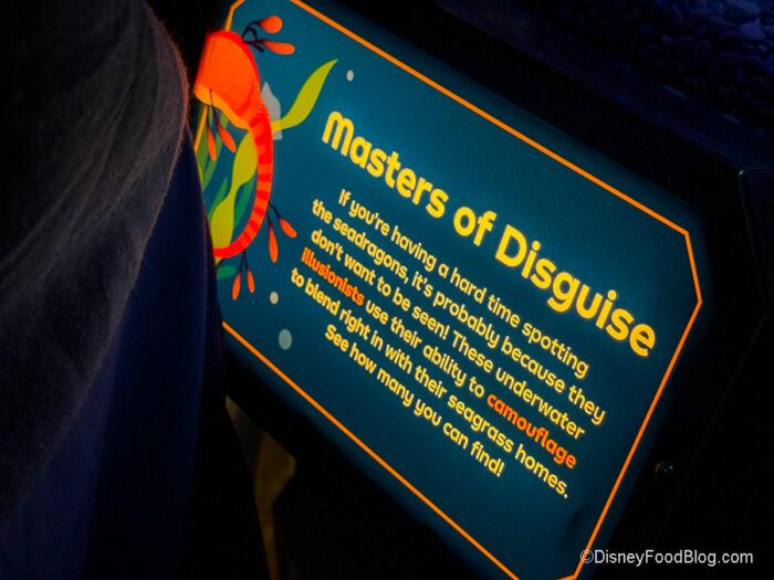 We also learned a lot about them while visiting The Seas. For example, seadragons don’t have a preference for dark or light environments. They just really like cold environments. That’s why their enclosures have coolers that keep the water around 70 degrees all year round for them.