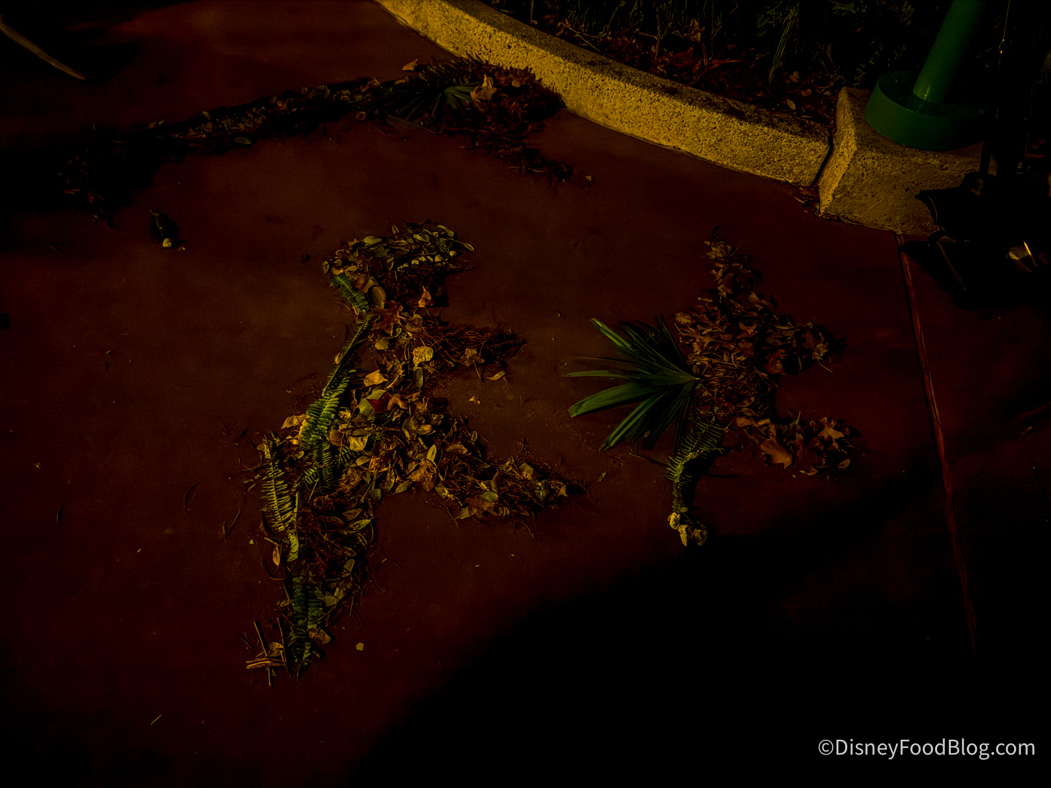 It was around 9:30 PM when our ride was finished, and as we walked out of the ride area, we spotted some super cute dinosaur leaf art, thanks to custodial Cast Members who really make incredible magic.