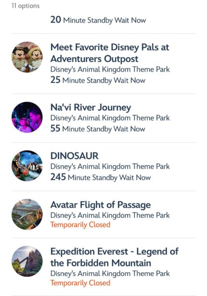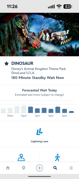 The wait time was 65 minutes, which is pretty wild! This ride usually didn’t have waits above 20 minutes, but that’s not true for the final day. For what may be the first time ever, Dinosaur has a longer wait time than Flight of Passage in Pandora.