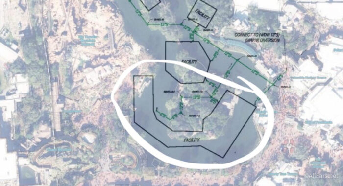 This was the shared map of the whole space. It’s oriented differently than you can see in the parks, but those buildings to the left are the area from Liberty Square to Frontierland with Big Thunder Mountain to the right. Picture you’re standing on top of the Haunted Mansion. While the Rivers of America is being filled in, it seems like more water elements will be added.