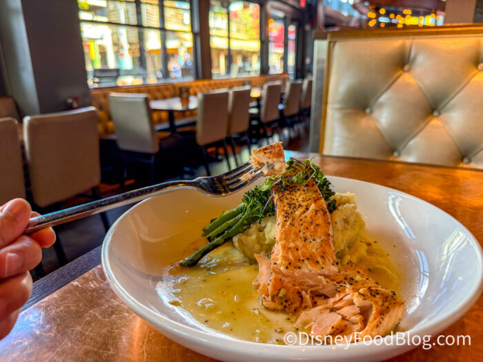After that, we tried the Grilled Lemon Seared Salmon for $33.95. This dish had grilled salmon, mashed potatoes, and grilled broccolini. The salmon was topped with lemon butter sauce and microgreens. Unfortunately, by the time we got to the salmon, it was a little cold. The only reason we’re bringing that up is that it was delicious despite it being a little cold, and normally we wouldn’t want to eat it cold, so that’s why we could tell it was just that good.