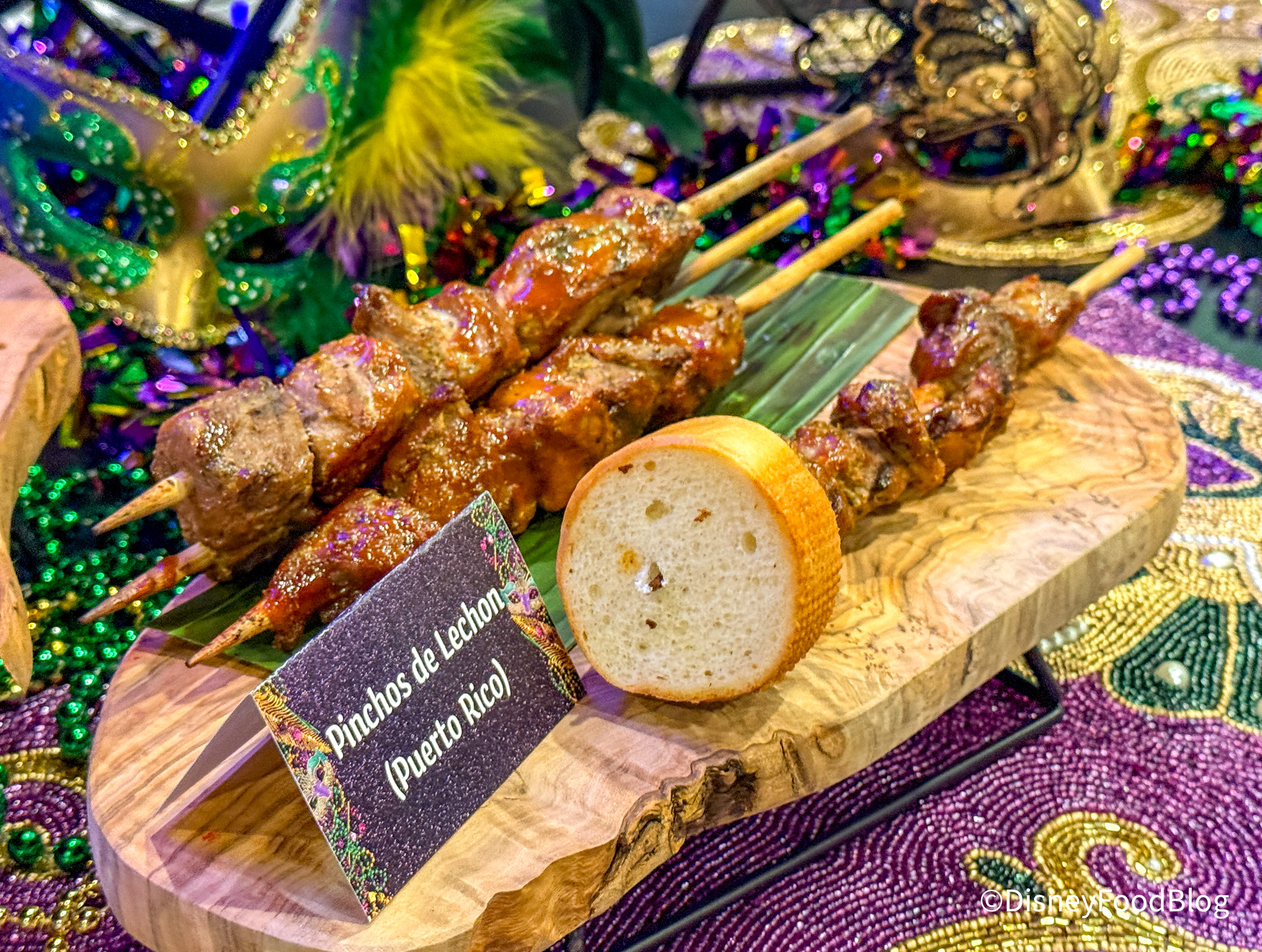 The Pinchos de Lechon (Puerto Rico) is made with Char-Grilled Pork Shoulder Skewer With Guava BBQ Sauce, and Pan Sobao. This is the best thing we ate at the Mardi Gras celebration…there, we said it. It’s got some nice Cajun flavor, but there’s also some sweetness to the BBQ sauce. The meat is smoky and cooked to perfection.