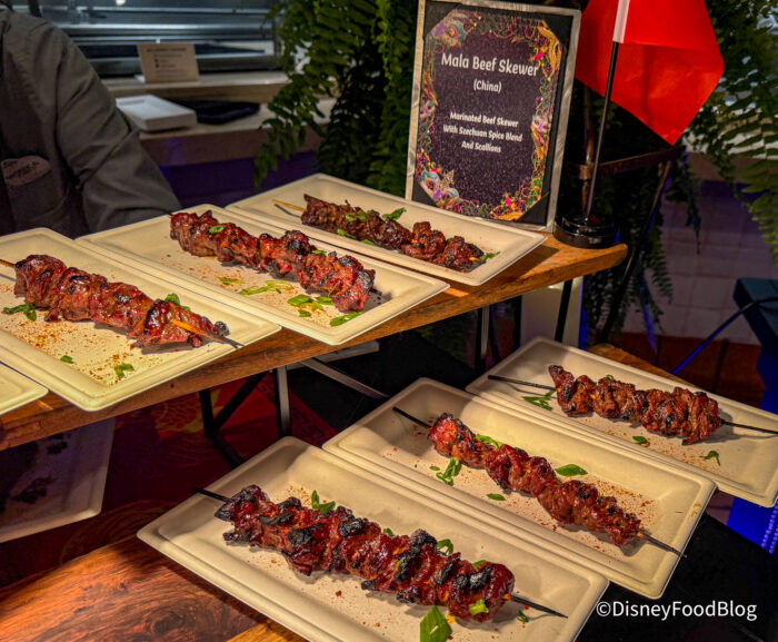 We also got a chance to taste some of the foods being served this year. The Mala Beef Skewer from China is a marinated beef skewer topped with Szechuan spice blend and scallions. It’s a long piece of meat wrapped around a skewer, but it has a sweet and peppery flavor. The meat is super tender, too, and there’s a LOT of it.