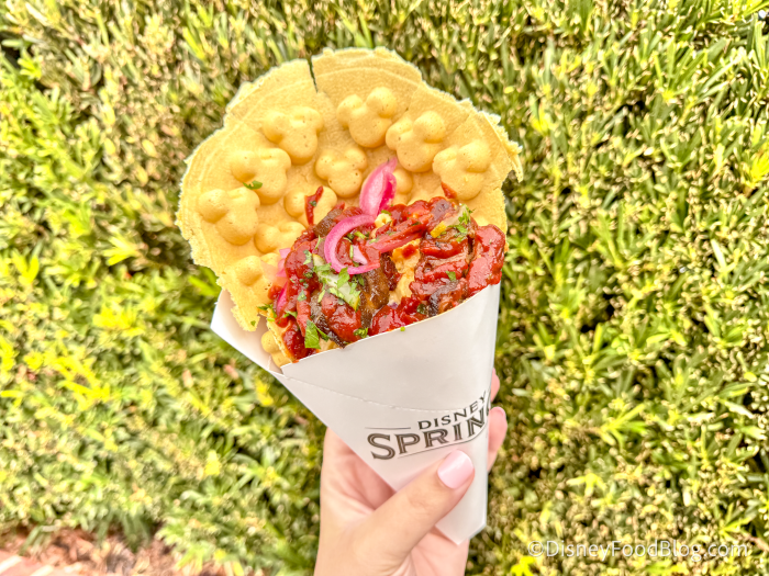 Imagine how excited we were when we discovered that Marketplace Snacks in Disney Springs was bringing us some new savory waffles. Now, we tried three, but one clearly stood out from the rest: the BBQ Brisket Waffle. BBQ brisket, sweet black pepper BBQ sauce, pickled onions, and chopped parsley. Oh, and there was also green onion AND mac and cheese inside!!! BBQ? Mac and cheese? SAY NO MORE.