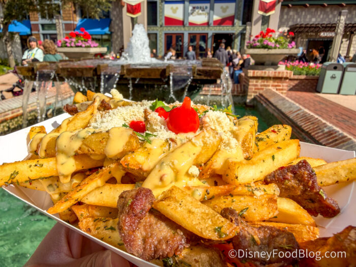 Yes, French fries have made our list of best snacks of 2026 so far, but these aren’t just any French fries. These are the Steak Frites from The Daily Poutine in Disney Springs. These fries are topped with flank steak, chimichurri, bearnaise sauce, sweet pepper drops, and grated parmesan.