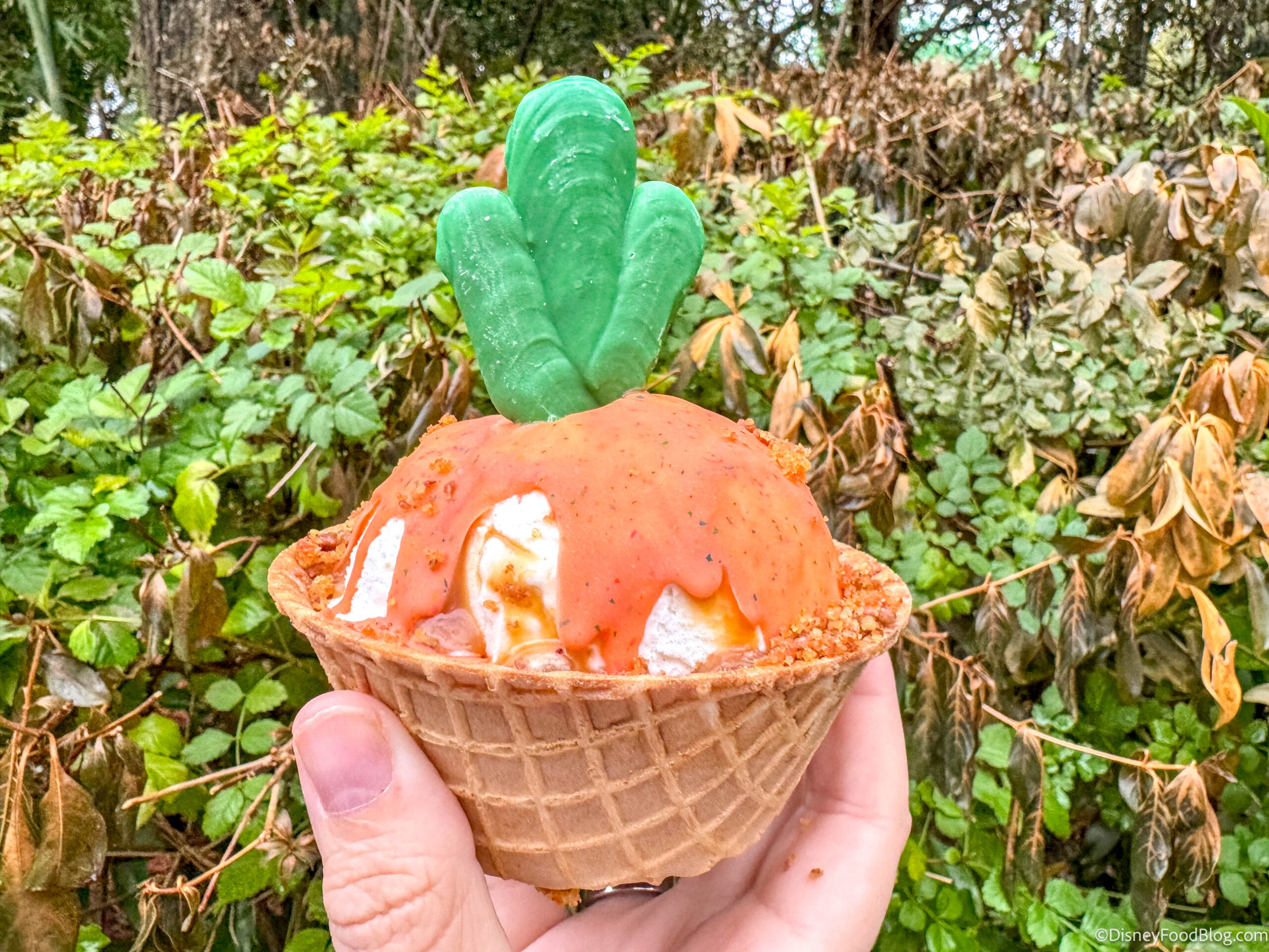 So here’s a surprise…a new carrot cake treat has popped up at Terra Treats, too, and we couldn’t get enough of it. It’s the Carrot Cake Sundae, an Annual Passholder exclusive treat that we’d share with the world if we could. You’ve got vanilla ice cream with caramel sauce, roasted pecans, and carrot cake crumbs in a waffle bowl topped with birthday cake-flavored shell and a chocolate carrot.