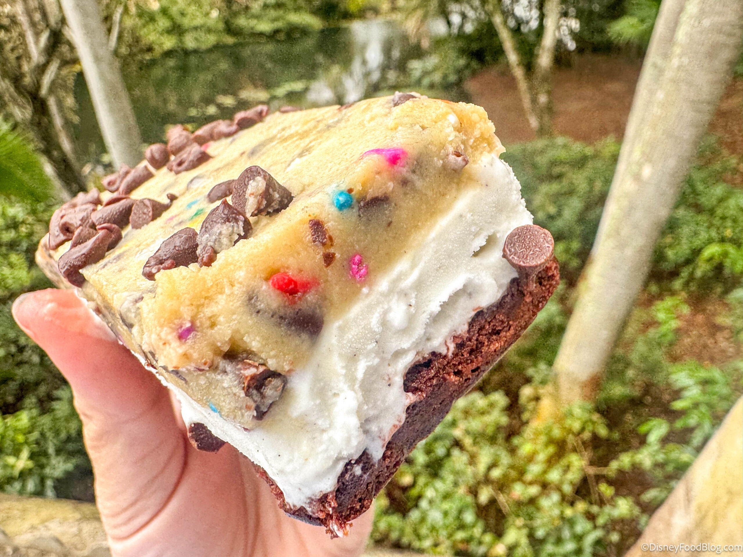 We thought we’d lost hand-dipped ice cream and cookie ice cream sandwiches in Disney’s Animal Kingdom forever when Dino-Bite Snacks closed, but they’ve come back even better at Terra Treats. The Cookie Dough Brownie Ice Cream Sandwich with cookie dough on top, ice cream in the middle, and a brownie at the bottom is a big upgrade to the Dino-Bites cookie ice cream sandwiches. It’s like all of our favorite things thrown together, and we are here for it.
