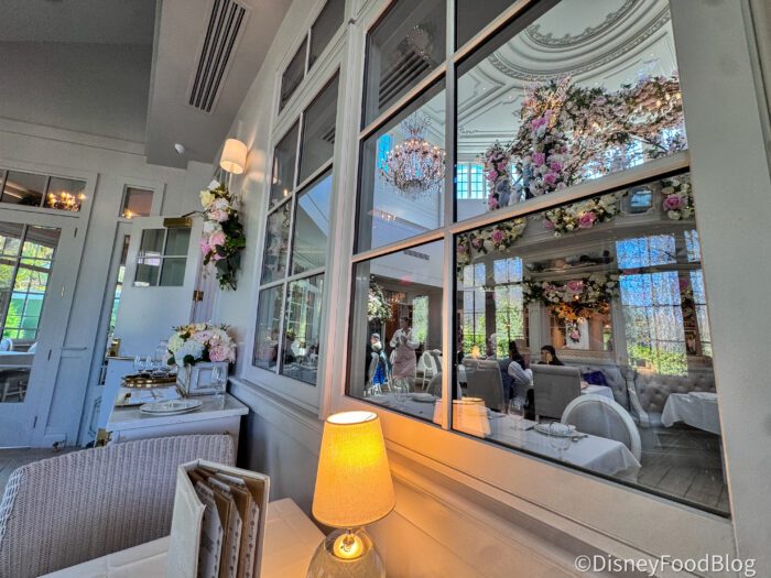 As you move deeper inside, the dining rooms feel almost like a series of little jewelery boxes, each one beautifully styled with its own personality, but all tied together by that same whimsical, celebratory vibe. The rooms are layered with ornate touches, from decorative mirrors and floral accents to soft lighting that makes everything feel warm and a little bit magical. It doesn’t feel like a typical Disney restaurant dining room where tables are just tables. Here, the entire space feels curated, like you’re dining inside a boutique ballroom in a storybook.