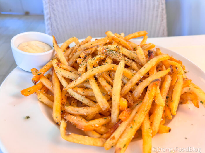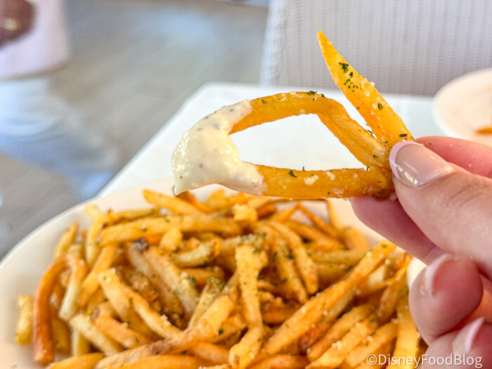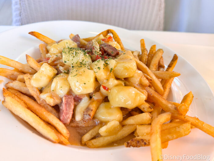 And then you get to the cheese curds, which are huge, soft, and super melty, more creamy than squeaky, which honestly makes them even more satisfying in this context. The fries are also excellent on their own: perfectly balanced between crispy and soft, and seasoned really well with that seasoned-salt flavor that makes them addictive before you even add toppings. Overall, this was one of the best “loaded fry” appetizers we’ve had on Disney property, and we would absolutely order them again!