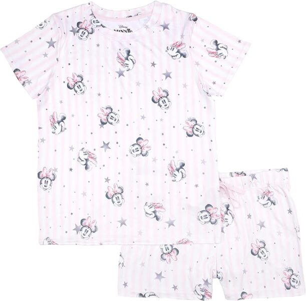 For a softer color palette, we found this Minnie Mouse-inspired summer set. This two-piece set features a pattern called Minnie’s Starry Nights. The shorts and top have a soft pink and white striped base. On top of that, there’s an overall print of Minnie Mouse in her pink bow dotted with stars. This set is made from an ultra-soft and comfortable cozy fleece fabric for cozy napping or lounging.
