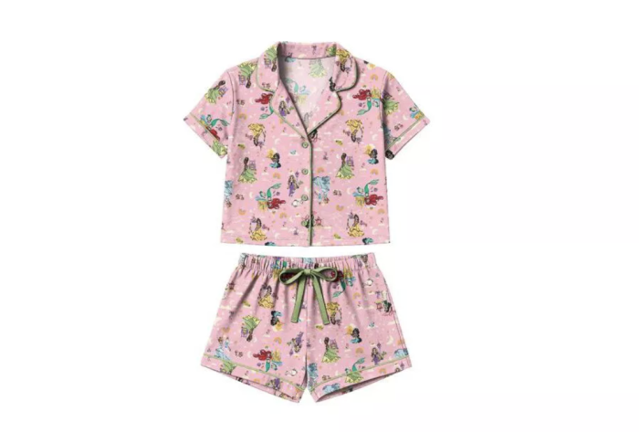 If you love the set above and you want to showcase your love for princesses day and night, Target is here for you! This set comes with a notch collar button-down shirt and shorts that feature an overall matching pattern. You can showcase your love for princesses like Tiana, Belle, Ariel, Cinderella, Jasmine, and more. We also love the soft green lining and ribbon detailing that really make this set pop.