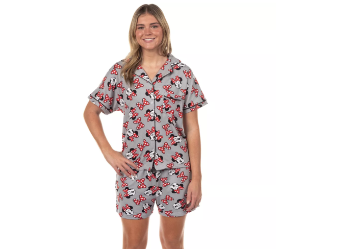Finally, we have this pair of Minnie Mouse pjs that feel classic and comfy! This set has an overall pattern of Minnie Mouse in her classic red polka bow, which really pops on this grey background. This set is designed to feel smooth against the skin, plus easy washing and wearing.