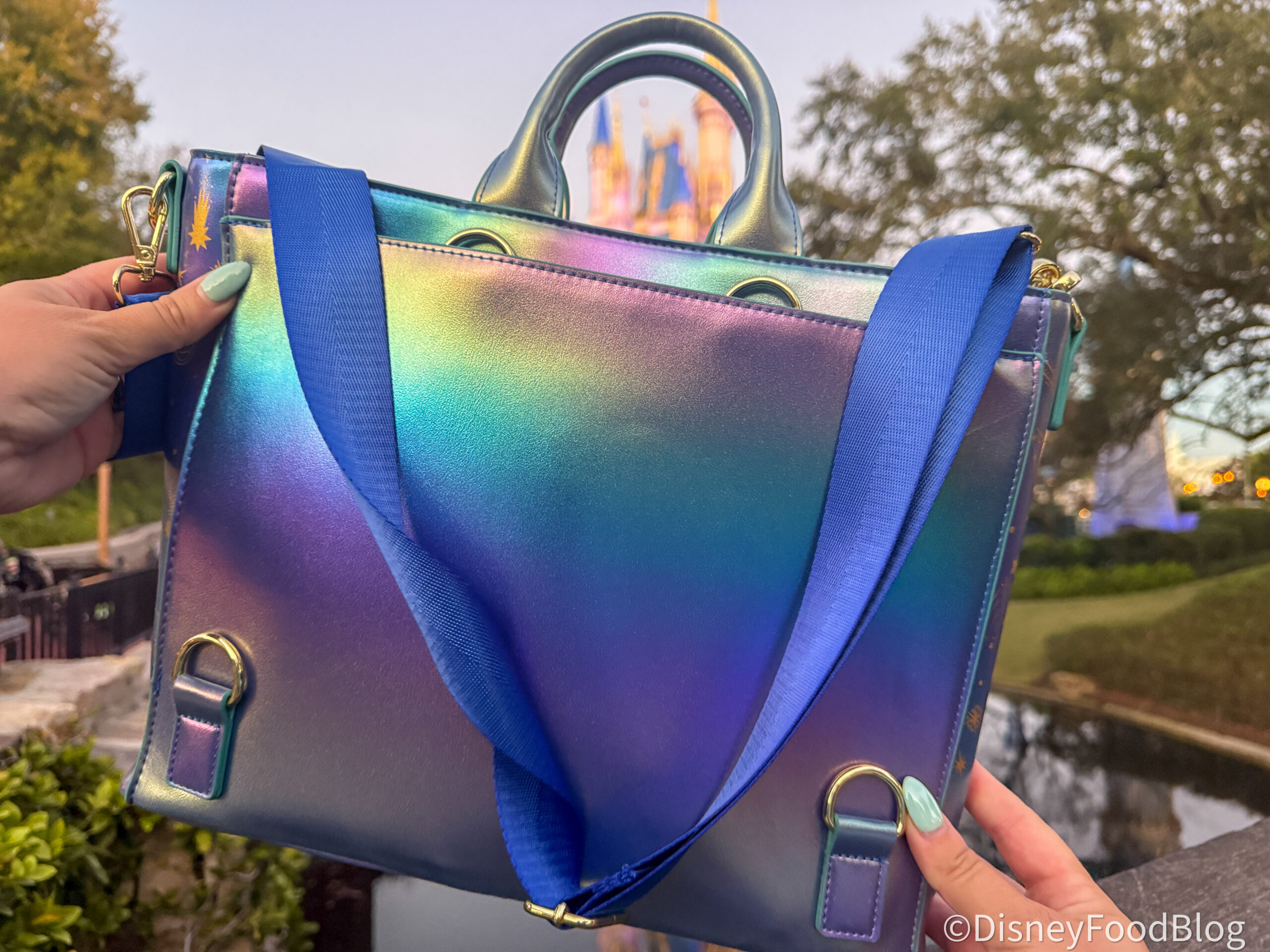 This stylish bag is perfect for anyone who loves Loungefly bags, loves Mickey (more specifically sorcerer Mickey), or simply likes shiny hues to their bags or to make a statement. Aesthetically, it also works for cosplay or DisneyBound in the parks, or if you just like a statement piece to wear around home. Either way, from our experience, you’ll get loads of compliments wearing it.