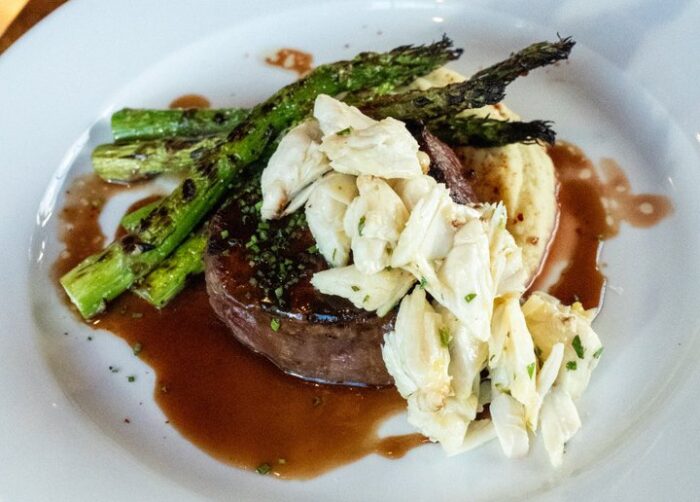 For an entree, you can get a delicate Branzino Filet or a Filet Mignon topped with lump crab.