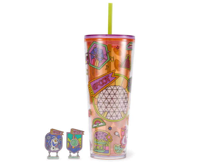 Rep the Experimental Prototype Community of Tomorrow with this orange Starbucks tumbler cup covered in Spaceship Earth, Figment, and more! The pin options are attraction icons like Spaceship Earth, Soarin’ Around the World, Journey of Water, plus characters like the seagulls from Finding Nemo, Olaf, and Figment.