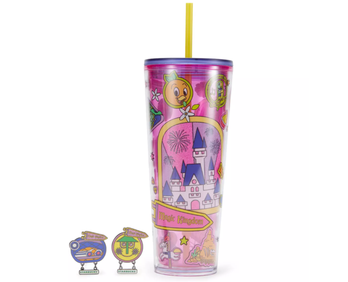 This Magic Kingdom Starbucks Travel Tumbler has designs of iconic attractions like Cinderella Castle, Space Mountain, “it’s a small world”, and more on the cutest pink cup. The pins are from attraction icons – there’s Madame Leota, a Jungle Cruise boat, a Mad Tea Party teacup, the “it’s a small world” clockface, Michael from the Enchanted Tiki Room, and a Lightcycle from TRON Lightcycle Run.