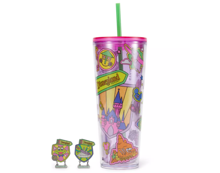 These are all high-quality double-walled acrylic tumbler cups. They’re 24 ounces, so it’s perfect to stay hydrated all day. The designs are all “sticker” style graphics with glitter accents inspired by attractions at your favorite park. Each cup comes with two mystery pins, with six options per park. These are official, tradeable Disney pins!