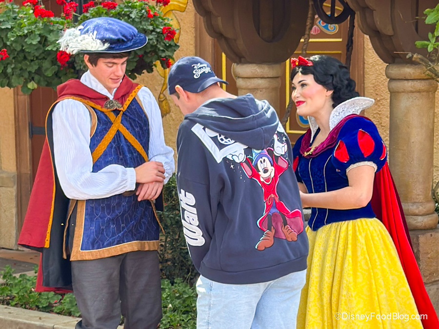 That’s right, for today only, you could meet the princes with their princesses in EPCOT. Now, we saw some really long lines for these meet and greets, so it wasn’t easy seeing them. However, we did get a peek at Snow White and Prince Charming as they greeted guests. We only got a peek, though, because the line for them was closed when we arrived.