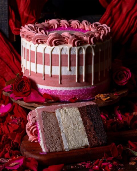 This weekend only, Gideon’s Bakehouse is offering a special cake, the Valentine Trinity Cake, which features a layer of strawberry cake, chocolate cake, and Italian cheesecake with strawberry buttercream, chocolate buttercream, and marshmallow buttercream. Yes, this cake is EXTRA. This cake slice, though, is ONLY available today, February 14th, and tomorrow, February 15th. You are limited to two slices per person, and it’s only available while supplies last.