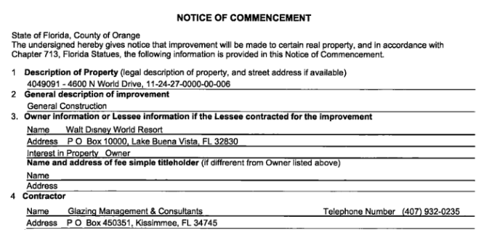 A permit filed by Walt Disney World for “general construction” lists Glazing Management & Consultants in Kissimmee, Florida, as the contractor. As you can probably tell by the name, this contractor specializes in glazing. On the company’s Blue Book profile, it lists its main lines of business as curtain walls, glass and glazing, and skylights and sky domes. The address on the permit matches the address for the Contemporary Resort; however, we don’t know exactly what sort of glasswork the contractor will be doing.