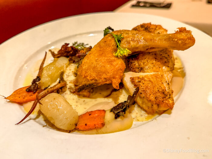 Then we turned our attention to the heart of our visit — the newest items on the menu. First up to try was the Half Roasted Chicken for $41. It’s made with White Bean Purée, Braised Cipollini Onion, Butter-poached Carrot, Roasted Mushroom, and Mustard Sauce.