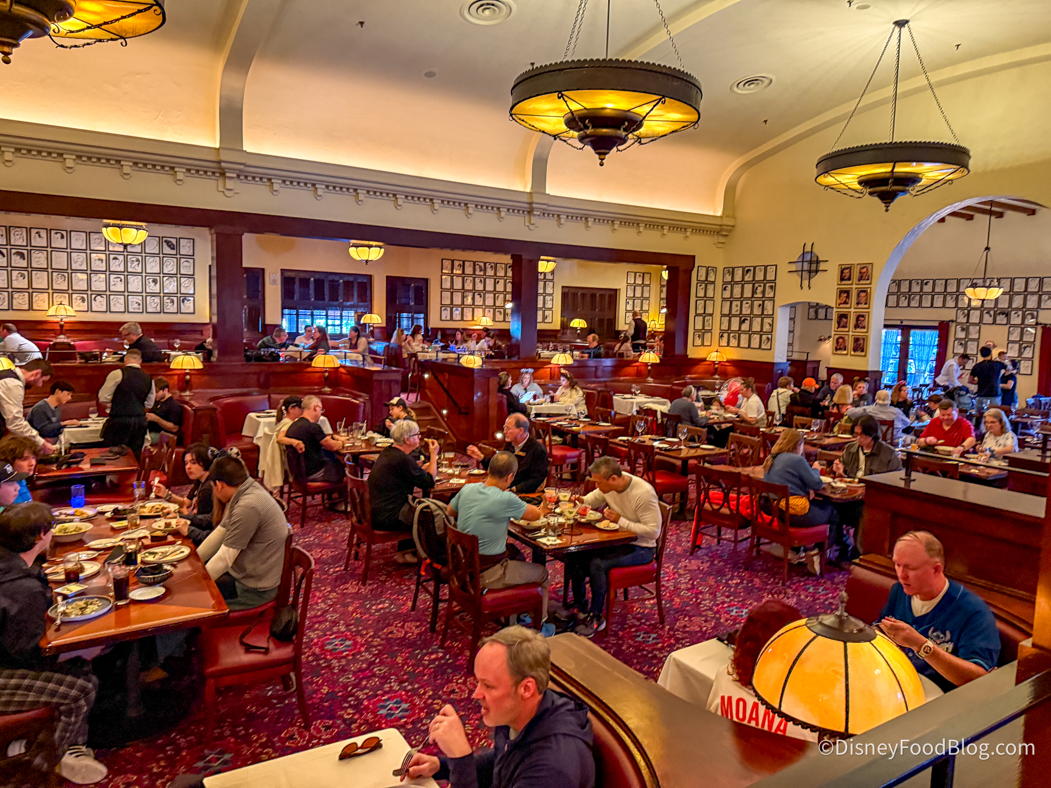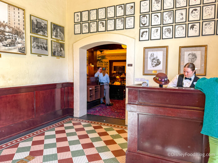 The interior design is rich with Old Hollywood charm, from dark wood accents and crisp white tablecloths to framed caricatures of classic Hollywood stars lining the walls. These caricatures aren’t just decorative — they add personality and history to the space, giving guests something to explore while waiting for their meal. The dining rooms feel intimate and thoughtfully arranged, offering a welcome sense of privacy compared to many of the more open, high-energy restaurants in Disney’s Hollywood Studios.