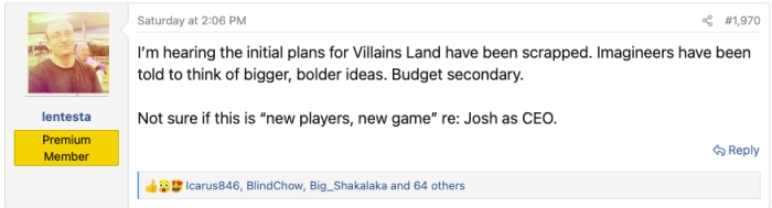 It’s no secret that expectations from Disney fans are high, and Josh D’Amaro, Disney’s current Experiences Chairman and upcoming CEO, has said this land will be “pushing creative boundaries” on “an incredibly twisted grand scale.” D’Amaro or Iger (or whoever is calling the theme park shots right now) is reportedly pushing the team to think bigger, which has led to the rumors and basis of the “scraped” rumors. Supposedly, the initial plans for the lands are being reconsidered for bigger ideas.