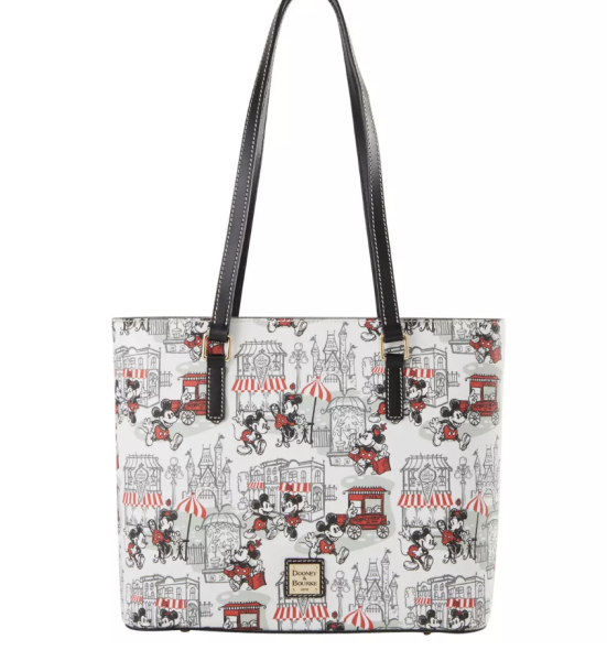 First up is the Mickey and Minnie Mouse Main Street Dooney & Bourke Tote Bag, which features Mickey and Minnie exploring Main Street and all its iconic stores. The design is mostly in a black and white artwork style, but there are pops of black and red all over as well. The bag also features a magnetic snap top closure, an interior zip pocket, two interior slip pockets, a cell phone pocket, and an interior key hook. It’s great to fit all you need, and the design is just one to obsess over.