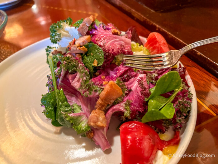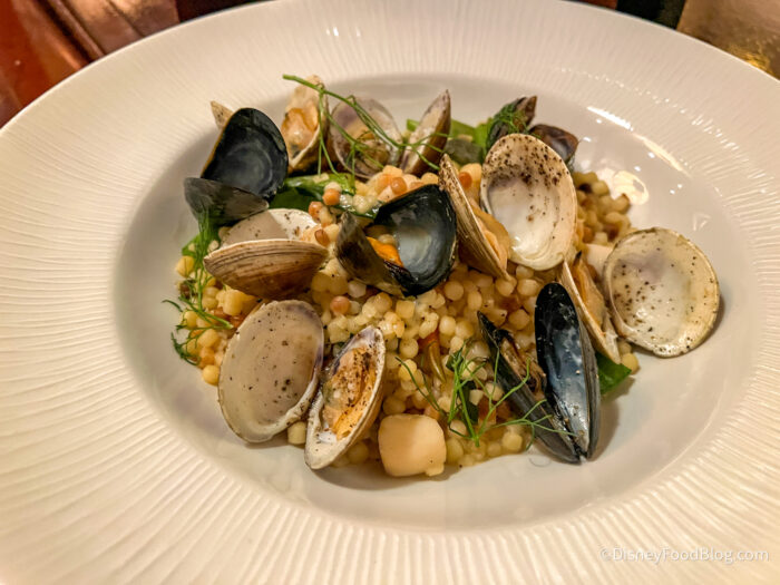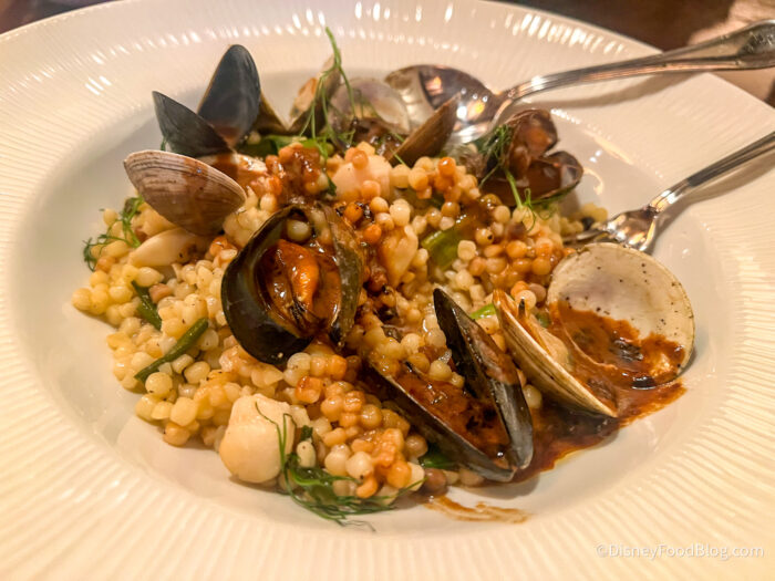 We were given a tiny fork to get the meat out of the clams, which was very helpful, but then you’ll actually want to use a spoon for the pasta, so we had to get the hang of switching back and forth. The sauce here was a dark sauce, which surprised us at first, but we were big fans of it, as it went beautifully with everything. The dish leans salty, but not overly so, and it’s certainly rich, so that’s something to keep in mind. We do wish it was acceptable to share a dish at a table service restaurant (but alas, that’s usually frowned upon), because this is a MASSIVE dish. We’ll also say that we don’t recommend eating this on a hot day in the parks, especially if you’re going to dine here for lunch, then go back out into the heat — your stomach likely won’t be happy with you.