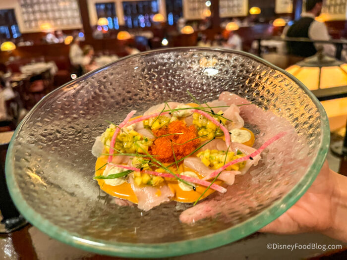We started off with an appetizer, and we grabbed the Hamachi à la Newburg to try for $17. This is Citrus-cured Hamachi, Creamy Newburg Sauce, Fruit Tartare.
