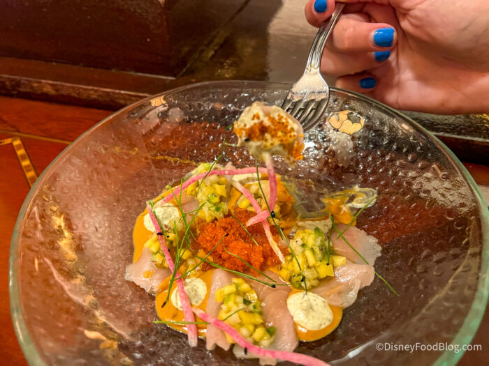 This type of dish has a habit of being overly acidic, but we were very pleased to find that wasn’t the case with ours! It does have acidity, which you’ll notice right on the tip of your tongue, but the flavors here are incredibly balanced. We could have ordered this over and over again and not gotten tired of it! The textures here overall were fantastic — the fish was so thin that it melted in our mouths, the radishes on top had a bit of a grainy taste like they’re supposed to, and the sauce was perfectly creamy. We know this won’t be for everyone due to the flavor profile, but if you’re feeling a bit adventurous, or you know it’s something you’ll enjoy, we don’t think you’ll be disappointed.