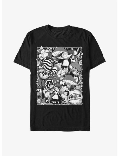 For the maximalists, the Disney Alice in Wonderland Black Alice Poster T-Shirt is a whole conversation starter. This shirt features a large rectangular graphic that looks like a vintage film poster, complete with a thin border that makes it pop against the dark fabric. The artwork is done in a striking black-and-white style and packed with detail.