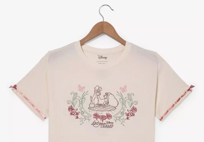 If cottagecore met Disney night, this would be the result. The Disney The Lady and the Tramp Floral Embroidered Women’s T-Shirt is another BoxLunch exclusive, and it leans all the way into soft, romantic details. The centerpiece is an embroidered version of the iconic spaghetti scene, framed by stitched florals, leaves, and tiny butterflies. Because it’s embroidery instead of a standard print, it has that elevated, boutique feel. The cream-colored fabric makes everything pop in the prettiest way.