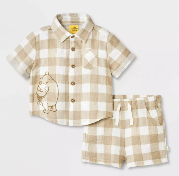 Can we all just take a moment to say “Aww?” This is so cute, it deserves that! This two-piece set is gingham with a sketch design of Winnie the Pooh and Piglet hugging on the front. The shirt is made with 100% cotton for that classic gauze look. It’s intended for newborns from 6-9 months.