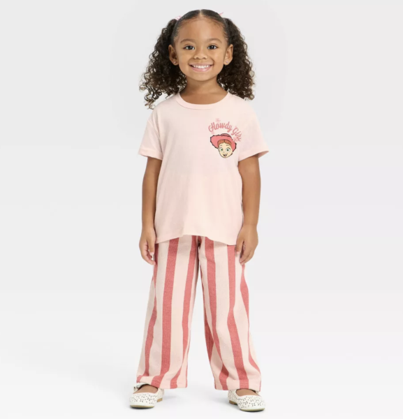 This is another 2-piece set for cute and easy dressing! This set has a light pink t-shirt with Jessie on the front with the phrase “Howdy Girl” on the front. On the back, you can see Jessie with the phrase “Cowgirl” across the shoulders. Jessie has traded her classic red in for a deep pink. The cotton pants are striped with the same dark and light pink color scheme! We can see this outfit on Slink Dog already.