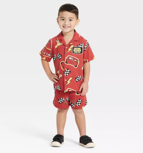The two-piece sets just keep winning in our eyes! This t-shirt and shorts set features an overall pattern of checkered flags, lightning bolts, and Lightning McQueen. It also has a logo on the front that says, “Lightning McQueen Race Team.” It’s also made with a gauze material, so it’s breathable and can hold up even during your long park days.