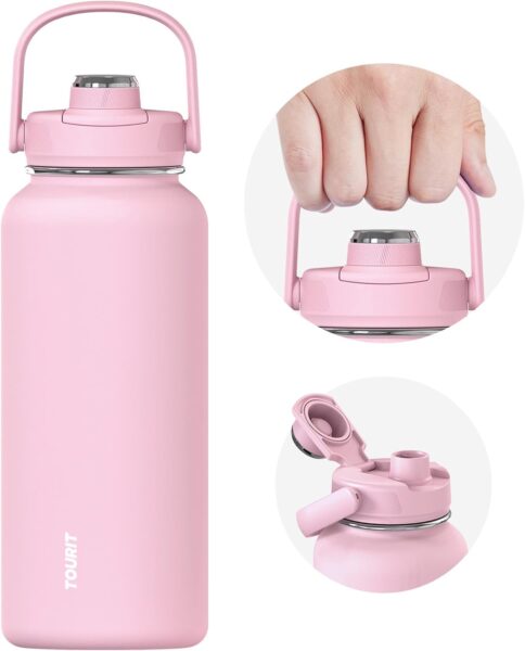 This TOURIT Insulated Water Bottle is a 32-ounce, double-walled, stainless steel water bottle. It can keep drinks hot for 12 hours or cold for 24 hours. Get it from Amazon with 8 color options.