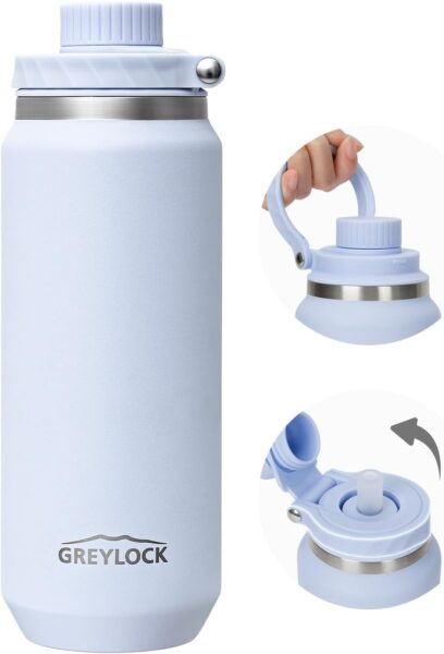 This GREYLOCK Insulated Water Bottle is leakproof and 24 ounces. It’s double-walled, vacuum insulated, and made of stainless steel that keeps drinks cold for 24 hours. The silicone straw is soft for easy drinking. It comes in 14 pretty colors inspired by nature.